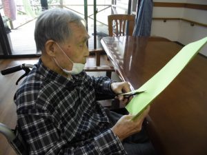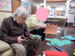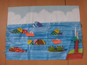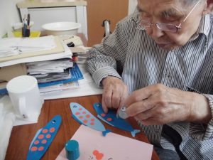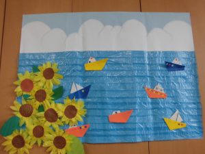 夏の壁画作品 おもやい 2021/08/09 19:05 2021年7月に壁画作製をおこないました。 夏なのでタイトルは「海」です♪ 入居者様と一緒に魚や船を作っていきました。 画用紙に魚やカエルを書いて、その線に沿って ハサミで切って頂きます。 船や魚は折り紙で作り模様をつけて装飾しました。 出来上がりがこちらです!! ひまわりが咲き、魚は気持ちよさそうに泳いでいて、 とても楽しく夏らしい壁画になりました。 東棟と西棟に飾らせて頂きました♪ グループホーム おもやい 次の記事へ 一覧に戻る 前の記事へ