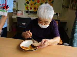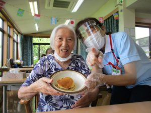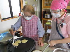 栄養課企画によるおやつ作りが行われ、ご利用者の皆さんが、“どら焼きづくり“に参加されました。
