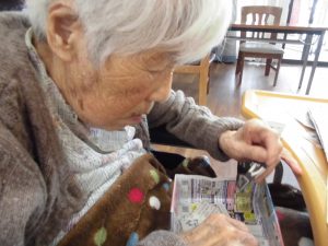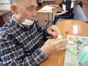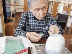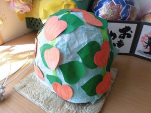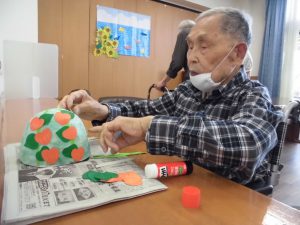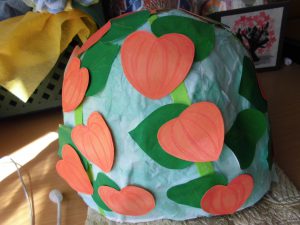 ホオズキのランプシェード おもやい 2021/09/04 8:36 2021年8月に入居者様と一緒にランプシェードを 作製しました。 今回はホオズキのランプシェードです♪ ちぎった新聞紙を糊で丸い形の土台に張り付けていきます。 土台が出来たら白い紙を糊で貼ります。 乾いたらその周りに色のついた和紙を張り付けます。 その上にホオズキの絵を貼って模様を付け完成です♪ とても綺麗に出来上がりました! さっそく玄関に飾らせて頂いてます☆ グループホームおもやい 次の記事へ 一覧に戻る 前の記事へ