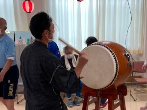 各病棟で趣向を凝らした露店では、射的やお菓子すくい、プロジェクターに投影した花火映像に、スタッフの浴衣姿も彩を添え、大変喜んで頂きました。スタッフの太鼓伴奏による盆踊りでは、患者さん方に笑顔が溢れていました。(#^^#)