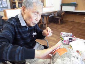 新聞で作った丸い土台にオレンジ色の折り紙を