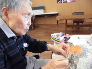 全体的に貼り終わり、糊が乾いたら、目、鼻、口を