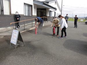 避難訓練終了後は、消火器を使用して訓練を行います。