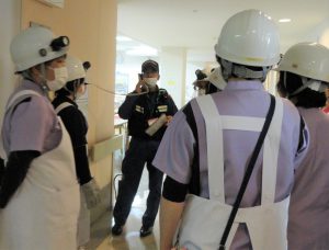 令和3年12月22日(水)、地元消防署の協力をいただきながら、当院にて消防訓練を行いました。「夜間帯に2階の職員休憩所から出火」したことを想定し、入院患者の人命救助と建物被害の軽減を図ることを目的とし、緊迫した雰囲気のなか、初期消火から避難誘導、119番通報、災害時における避難経路確認など各職員が迅速に役割を果たしていました。