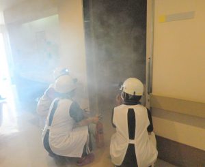 消防員からは「(周りに火が広がらないように)火元の扉を閉めたのは良かった」「力のない方でも簡単に消火器を運べる方法」などご教授いただきました。消防訓練に参加した職員からは「普段触らない消火器の取り扱いを学べた」「火が天井まで達したときは初期消火が有効ではないのには驚いた」という感想が聞かれました。