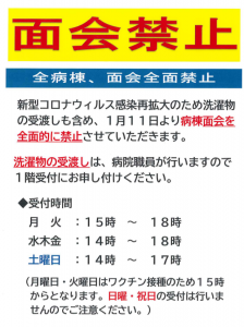 病棟面会禁止について 聖和記念病院 2022/01/11 16:00 新型コロナウイルス感染再拡大のため、1月11日(火)より病棟面会を全面的に禁止します。 洗濯物等の受渡しについては下記の内容をご確認ください。 なお取り扱いを中止していた「LINEを使用したオンライン面会」は1月11日(火)から予約受付を再開します。 次の記事へ 一覧に戻る 前の記事へ