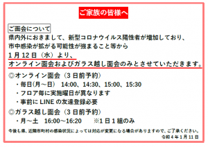 1月12日水曜日より以前のようにオンライン面会およびガラス越し面会で対応させて頂きます。