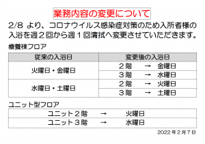 入所者様の入浴を週2回から週1回清拭へ変更させていただきます。