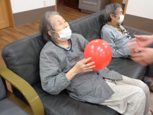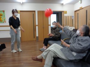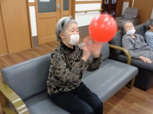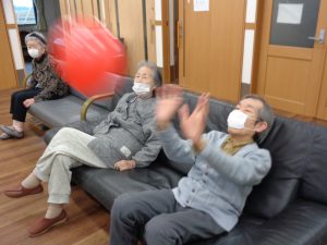 風船バレー おもやい 2022/03/03 16:07 日中、風船バレーをしませんか?と声を掛けると「面白そうね」と 参加してくださいました。 まず初めに体操を行いました。手首を傷めないように ほぐして頂きます。 風船を準備して開始です♪ 「それっ!」「ほっ!」と自然に声が出てあり、みなさま上手にパスを 回して楽しんでありました♪ グループホームおもやい 次の記事へ 一覧に戻る 前の記事へ