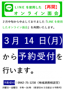 本日から「オンライン面会」の予約受付を再開します 聖和記念病院 2022/03/14 12:00 2月中旬から中止しておりました「オンライン面会」の予約受付を本日から再開いたします。 オンライン面会方法に関してはこちらをクリックしてご確認ください。 次の記事へ 一覧に戻る 前の記事へ