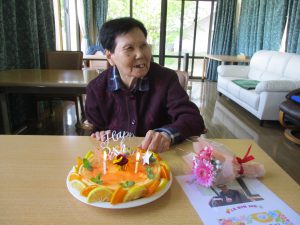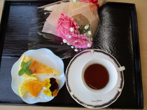 お誕生日の歌をお花、お祝いのカードをプレゼントさせていただいた後、冷たいチーズケーキを召し上がっていただきながら、和やかなひと時を過ごしていただいております♬