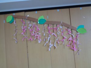 壁画作製 桜 おもやい 2022/05/13 6:06 春の壁画作製を行いました。今回のテーマは 桜です。 厚紙を桜の形に切って皆様に貼り合わせて頂きました。 完成はこちらです。↓ テレビ付近の目立つ所に飾らせて頂きました。 雰囲気が明るくなり、目につくので「きれいね!」と 入居者様が言って下さいます♪ すだれ桜は柔らかい和紙のようは花紙で作って 行きました。 花紙を細く切り、毛糸に一列に間隔を空けて結んで 行きます。細かい作業でしたが入居者様が何日間か かけて完成して下さいました♪ グループホームおもやい 次の記事へ 一覧に戻る 前の記事へ