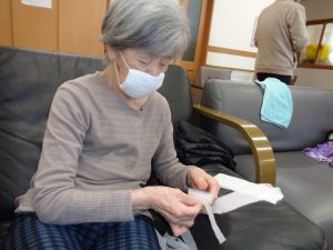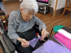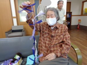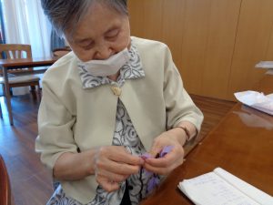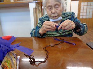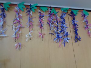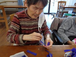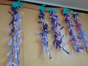 壁画作製 ふじ おもやい 2022/06/24 19:14 4月も終わる頃、壁画作製を行いました。今回のテーマは「藤」です。 花弁が長くしだれた、紫の藤の花を表現して作りました。 柔らかい花紙を細長く切って、茶色の枝に見立てた 1本の毛糸に、切った花紙を約5㎝ほど間隔空けて 結んで行きます。 前回作った桜と同じく細かい作業ですが、皆様集中して 作ってありました。 出来上がりがこちらです♪ 両棟に飾らせて頂きました。1本1本手作りなので どれも違う味が出ていてとてもキレイです♪ グループホームおもやい 次の記事へ 一覧に戻る 前の記事へ