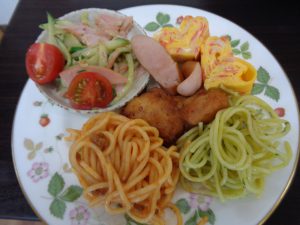 メニューはシチュー、唐揚げ、パスタ、ウインナー、サラダ、卵焼き、