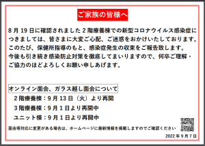 9月7日をもちまして保健所指導のもと、収束となりました事をご報告致します。