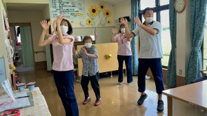 テンポの速い、ノリノリな音楽に合わせ、体を軽快に動かします。あまりのハードさに平均年齢5?才の職員の息も絶え絶えで汗だく💦 2週間で10㎏瘦せる!とも言われているとか…(笑) そして…