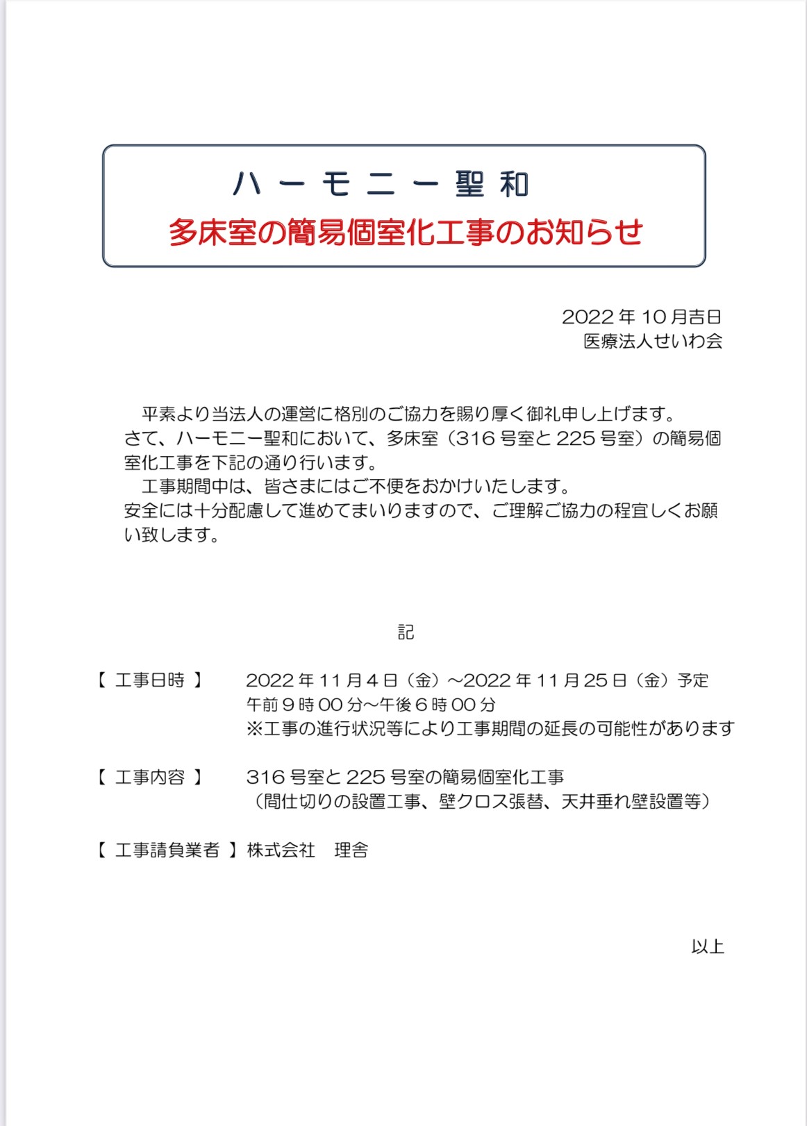 ハーモニー聖和において、多床室(316号室と225号室)の2部屋を簡易個室化にする工事を予定しています。