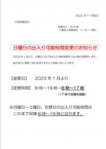 2023年1月より、日曜日における出入り可能時間を下記の通り変更致します。
