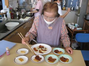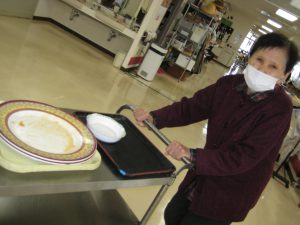 感染対策も行いながら、お皿に盛りつけていきます。T様は、ご自宅でも家事作業はまだまだ現役✨