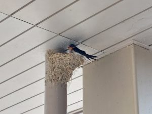 また、プランターの設置作業をしていると、玄関の柱にツバメの巣を発見しました。