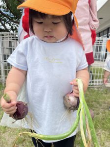 おとのわ保育園では 食育の一環として季節の野菜を栽培・収穫しています 冬に植えた紫たまねぎが食べごろになり 5/26(金)に収穫しました 先生と一緒に引っぱって 大きなたまねぎがとれました(^^)/ 次はさつまいもを植える予定です 秋の実りも楽しみですね(*^-^*)![]()