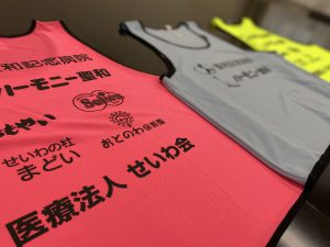 院外活動時は白衣や制服を身に着けない場合もあり、病院スタッフであることが判別しづらいため、一目で病院職員であると認識していただけるようビブスを着ることになりました。