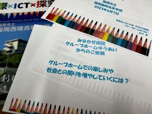 2023年6月7日に福岡市立福岡西陵高等学校探究授業『アイディア屋』の課題提示会に参加しました。西陵高校での探究授業は今年で3年目になります。みなかぜ病院からは『グループホームゆうあいでの楽しみや社会との関りをふやしていくには?』という課題を準備しました。最終プレゼン会迄の半年間で、課題解決に向けたチーム学習をして頂くことになります。高校1年の生徒さんは、精神科医療やグループホーム、患者さんの事など、様々な質疑応答を通し、イメージを膨らませていました。これから精神科医療について学びを深めながら、中間・最終発表会に向け、様々なアイディアを考えて頂けるものと思います。探求授業を通し、少しでも精神科医療・障害福祉についての理解を深めてもらえるように、高校生とともに楽しい学びの時間にしていきたいと思います