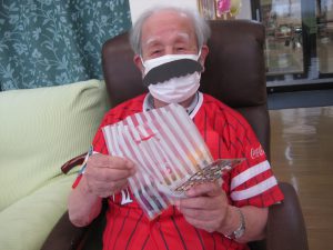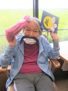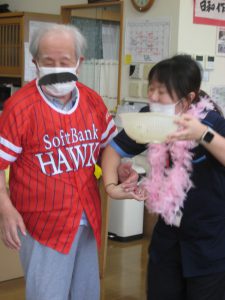 イベントでは、職員とご利用者様にも”付け髭”を着用して頂き、音楽に合わせて『ひげダンス』を踊りました!踊るだけでなく、もちろん芸も!!!!