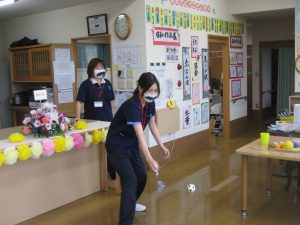 さぁ、職員の持っているコップにボールを入れる事が出来るでしょうか?!
