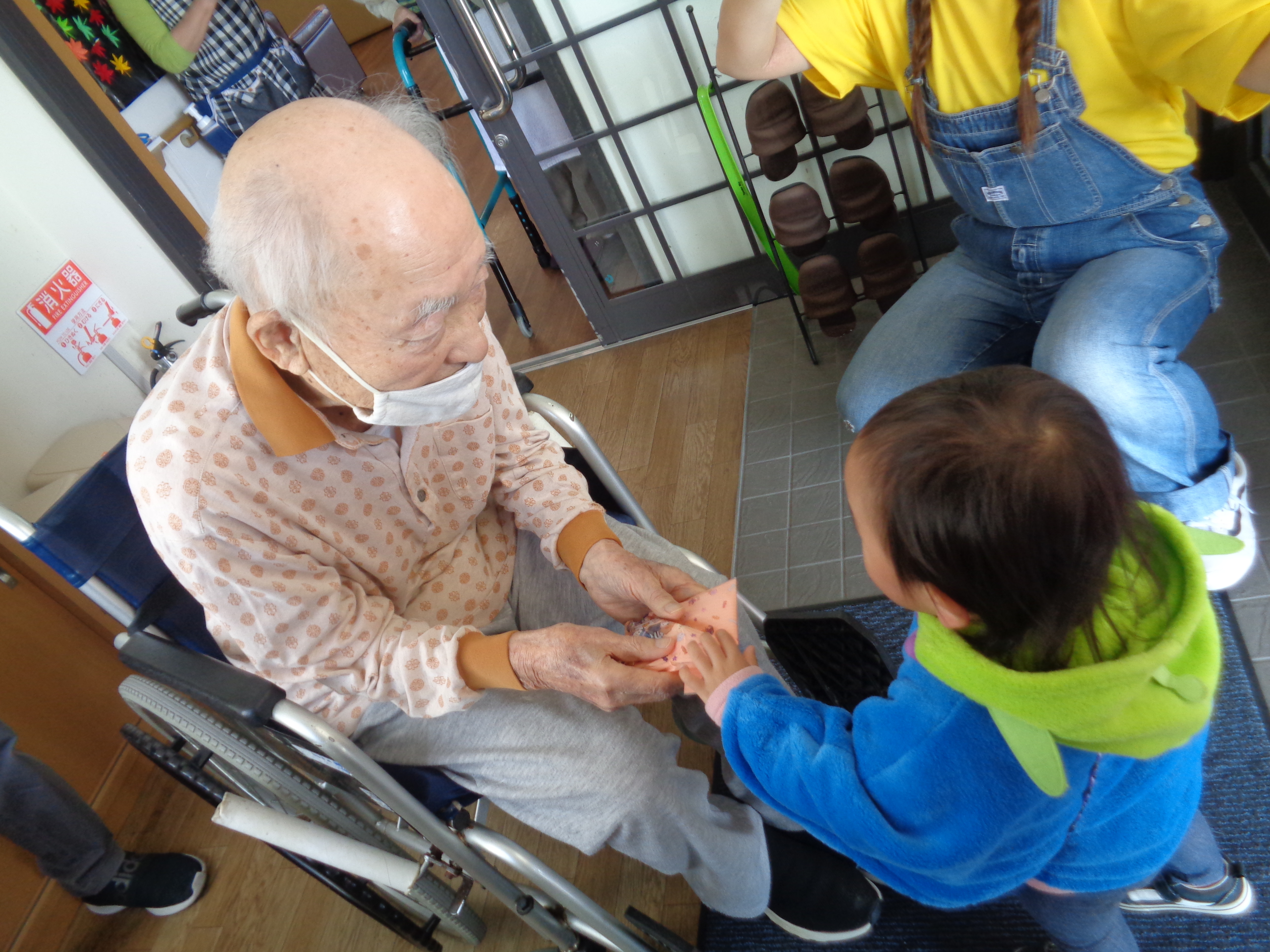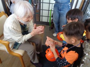 入居者の方は小さな来客にとても喜ばれお菓子を渡していました。