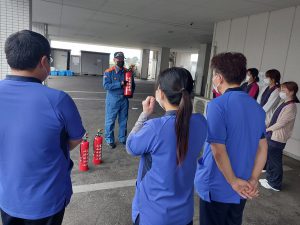 最後に消火器の使用方法を教わり、職員たちも水を入れた消火器を使用して消火訓練を行いました。