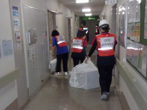 今回は2階西病棟を出火元と想定し、院内アナウンスから患者さんの避難など、実践的な訓練を実施しました。