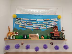 山の麓ではリハビリ職員が制作した可愛らしい金太郎と熊が遊んでいます。頭の上に小さなかしわ餅を乗せているところがチャーミングです。