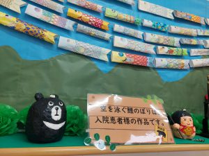 4月10日(火)より待合室の展示スペースに当院の入院患者さんが色を付けた鯉のぼりを展示しています。