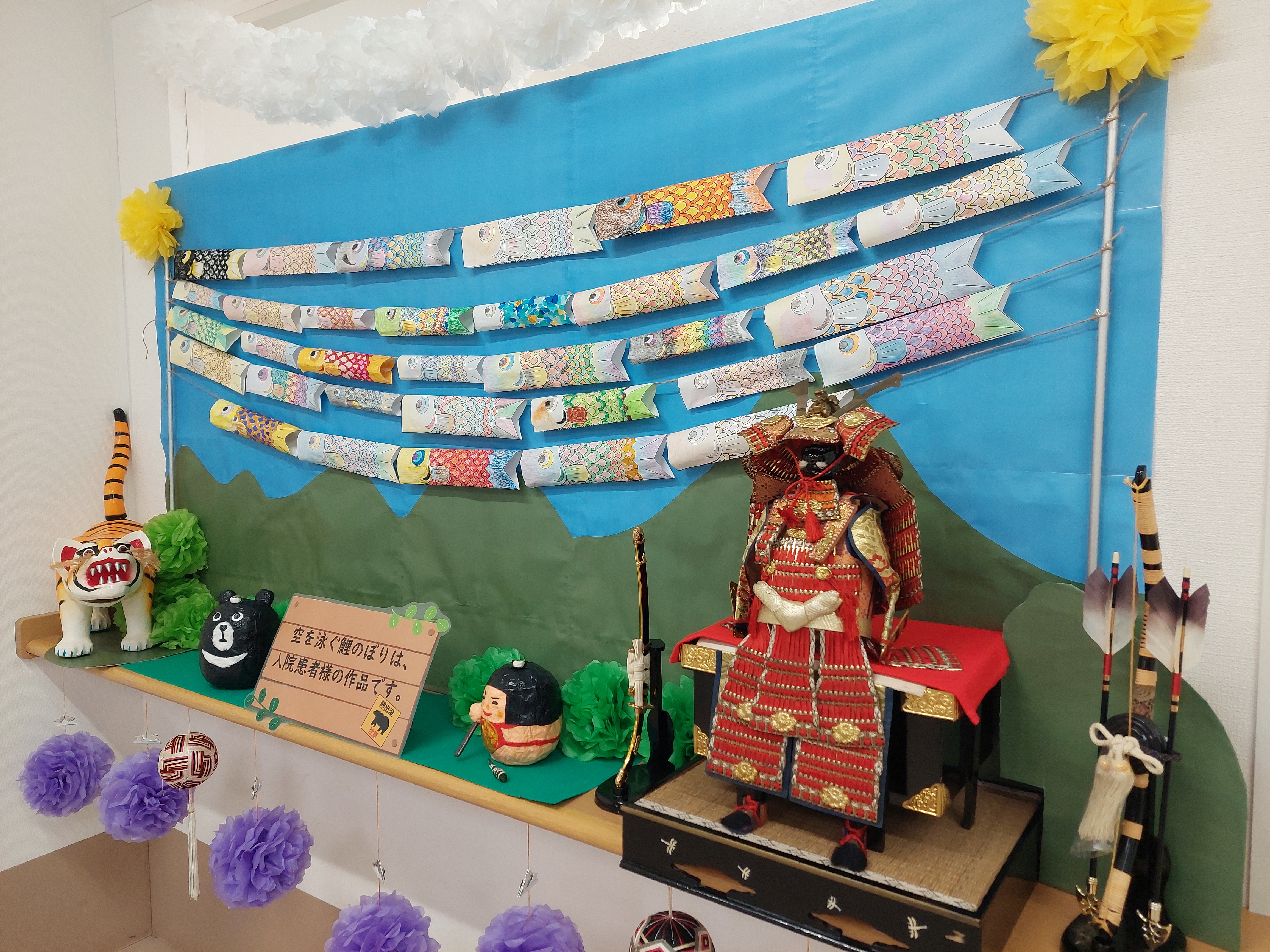 4月10日(火)より待合室の展示スペースに当院の入院患者さんが色を付けた鯉のぼりを展示しています。