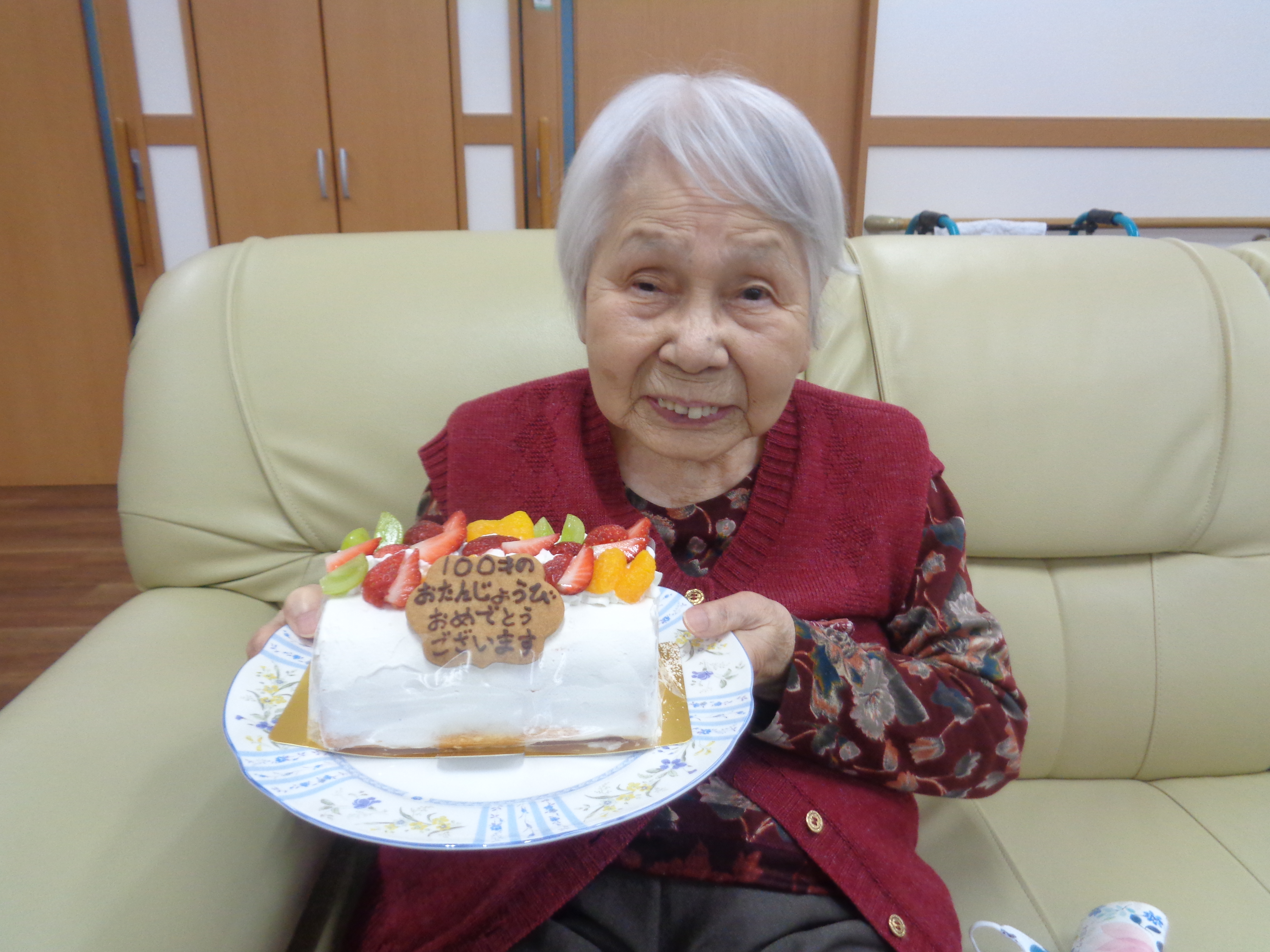 O様、100歳に(*^^*)誕生日にはご家族の方と一緒にお祝いされ喜ばれる姿がありました(^^♪