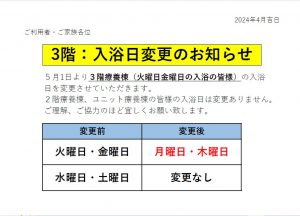 5月より、3階療養棟 入所者様(火曜・金曜ご入浴の方)の入浴曜日が変更となります。