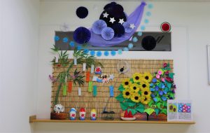 朝顔とひまわりは当院に入院中の患者さんに制作いただいております。また、七夕の短冊には患者さんにお願いごとを書いていただきました。