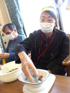 こちらは「ビー玉掴み」! 片手で一度にたくさんのビー玉を掴んで、その重さを競う競技です(^^♪
