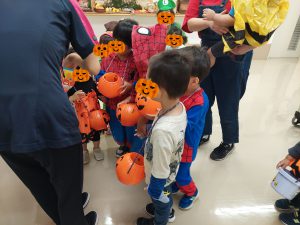 園児たちは病院スタッフからお菓子をもらい、かぼちゃの入れ物にお菓子をたっぷりと入れて嬉しそうにしていました。