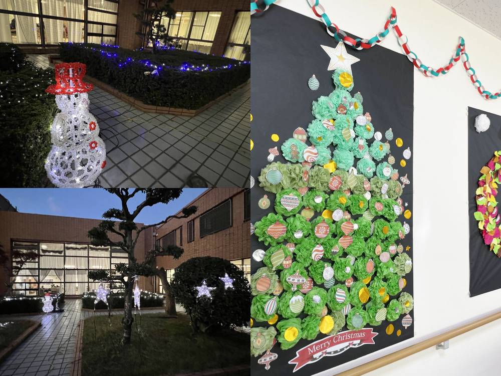 院内中庭はイルミネーションで彩り、会場はクリスマスで装飾しました