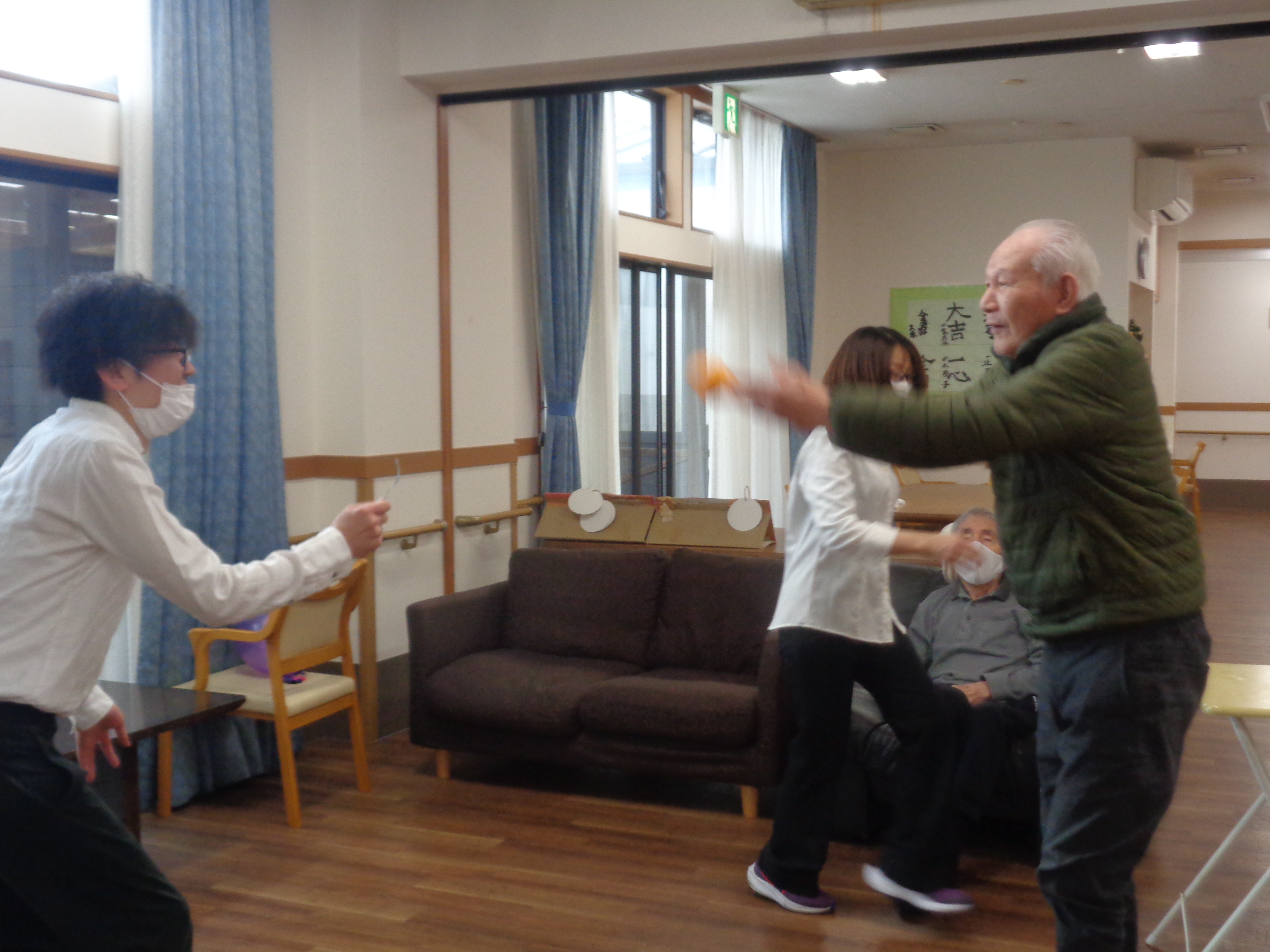 職員余興では髭ダンスを披露し、上体反らし・風船割り等、色んな芸の中でも果物刺し芸が特に賑わいました。
