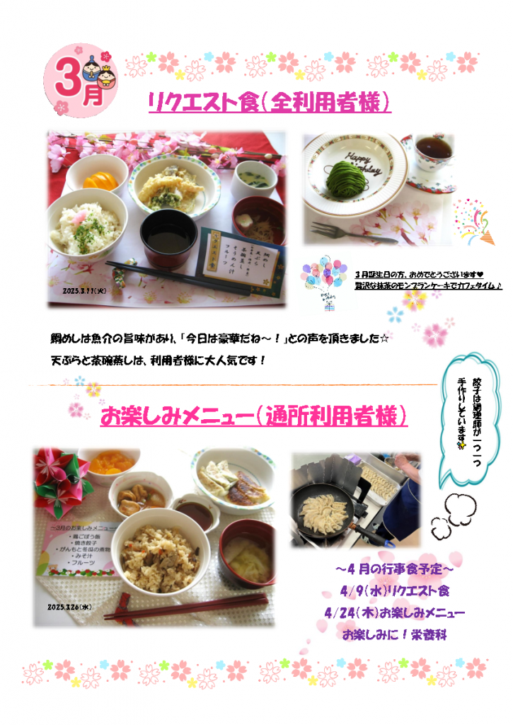 栄養科だより 25.4月号 ハーモニー聖和ブログ 2025/04/07 9:46 皆さま、こんにちは!ハーモニー聖和の栄養科です🌸 各地で桜まつりなどイベントも開催され、お弁当をもって花見に出かけられた方もいらっしゃるかと思います🍱 花より団子ではないですが、たけのこ、春キャベツ、新玉ねぎ、新じゃがいも、アスパラガスなど、春が旬な野菜を味覚で楽しむのも良いかもしれませんね😋 次の記事へ 一覧に戻る 前の記事へ