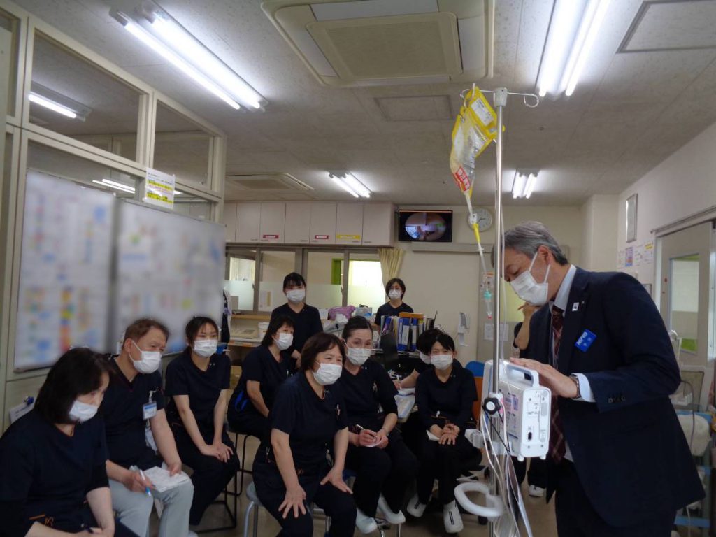 当院にて医療機器安全管理研修「輸液ポンプ説明会」を開催しました。今回は、輸液ポンプの業者様をお招きし、最新機種の取り扱い方法・安全対策についての実践的な説明を行っていただきました。