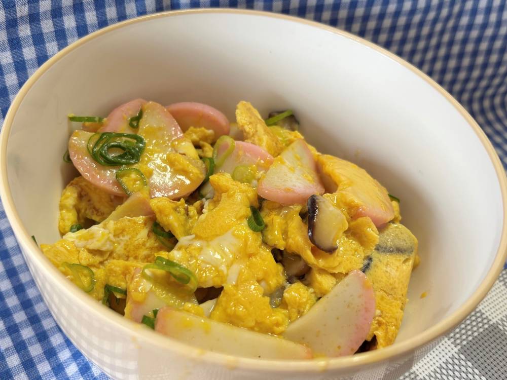 フライパンでかまぼこ・しいたけを炒め、卵液を流し入れます。
