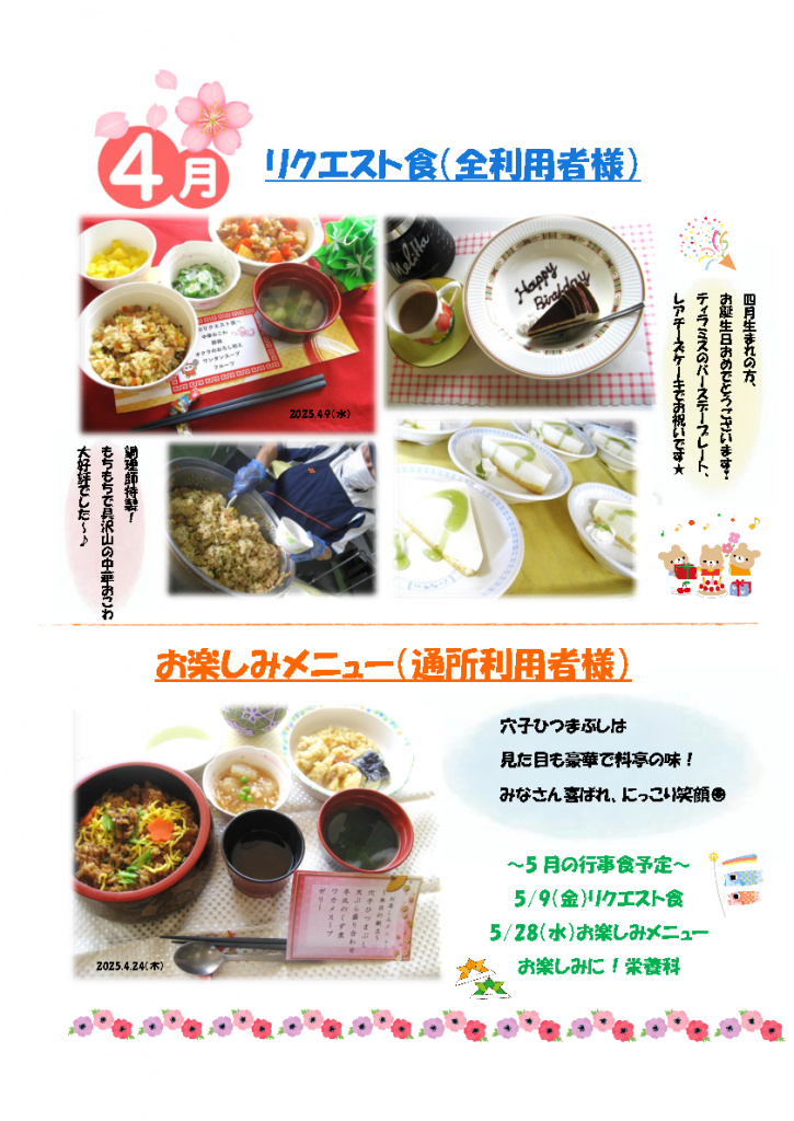 栄養科だより 25.5月号 ハーモニー聖和ブログ 2025/05/07 12:47 皆さま、こんにちは!ハーモニー聖和の栄養科です🎏 新緑が美しい季節となりました。5月は気温が上がり、汗ばむ日も増えてきます。環境の変化や気温の上昇に体がついていかず、不調を感じやすい時期でもあります。そんな時期こそ、栄養バランスの良い食事で体調を整えていきましょう! 今月のおすすめ食材:新じゃがいも・そら豆・アスパラガス ●4月のリクエスト食とイベント食🍱 次の記事へ 一覧に戻る 前の記事へ