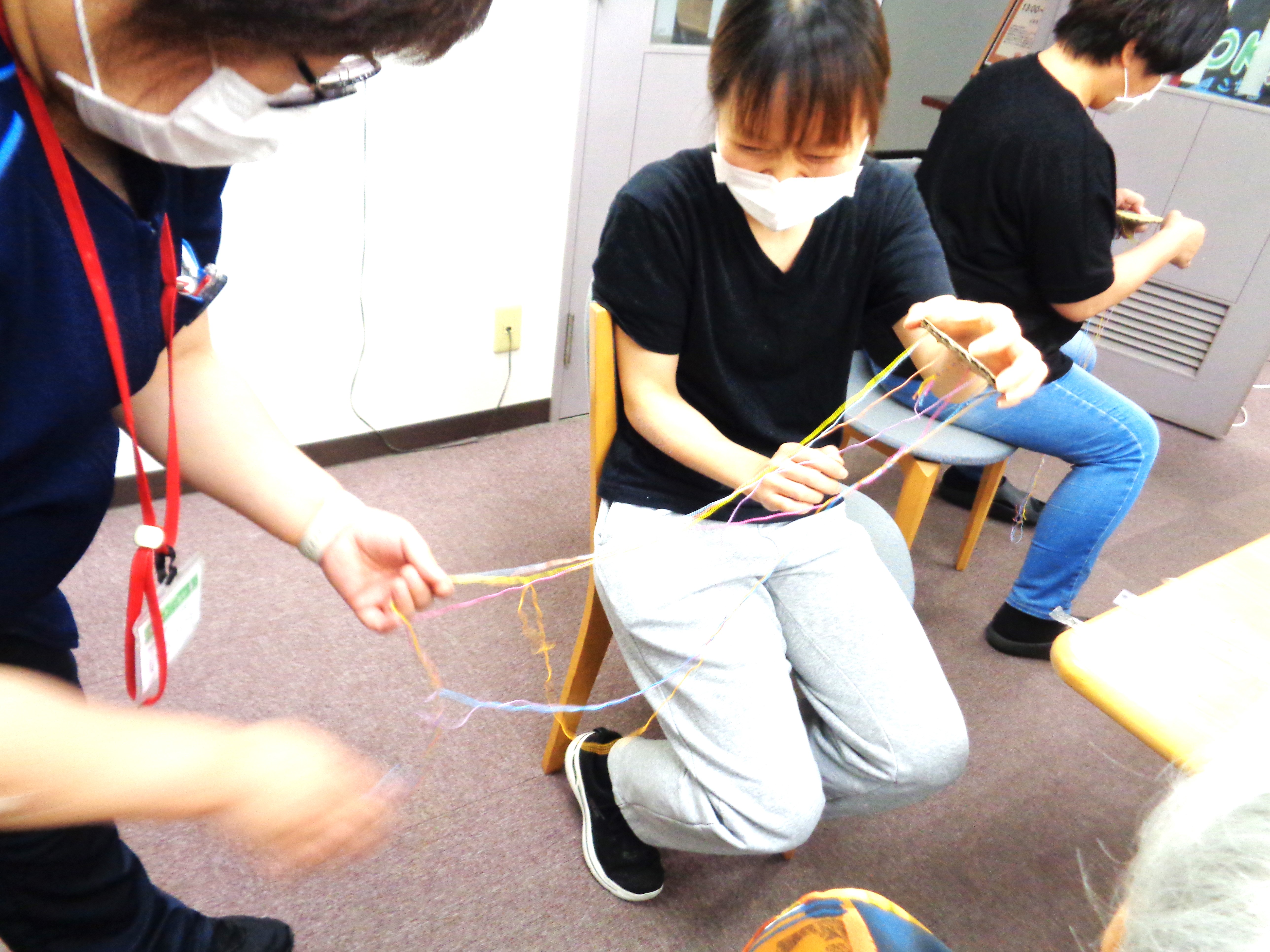 見かねた職員がほどくのを手伝っています。皆絡んでないのになぜ絡まる(?_?)