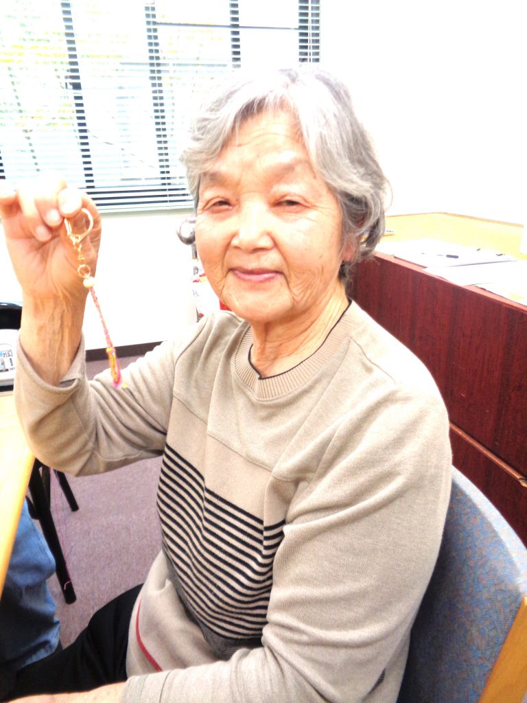 程よい長さになったらキーホルダーにするか、そのままミサンガにするか決めてもらいました。