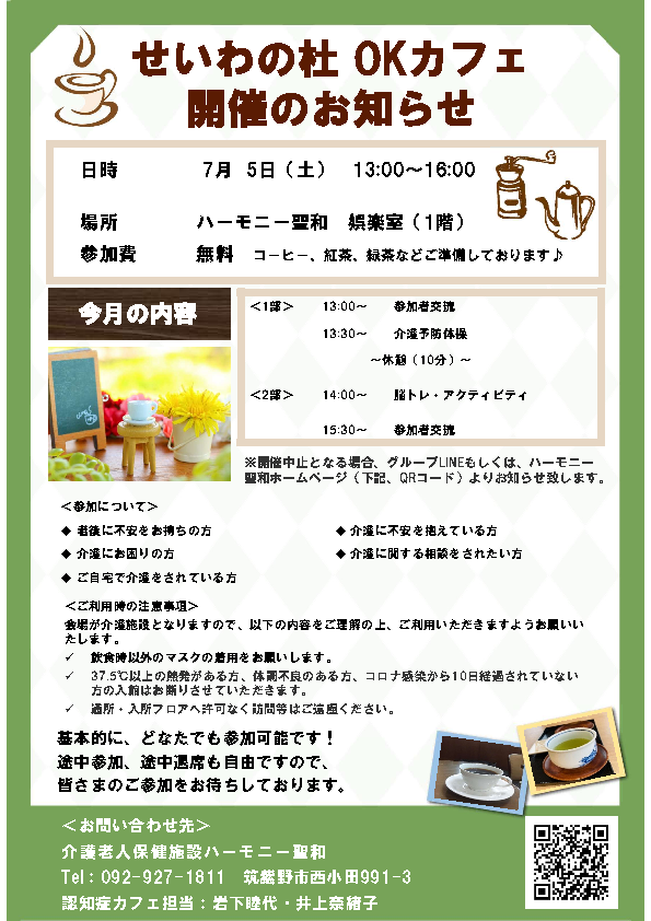 せいわの杜 OKカフェ(認知症カフェ)の取り組み|医療法人せいわ会/介護老人保健施設 ハーモニー聖和 (seiwa-kai.com)