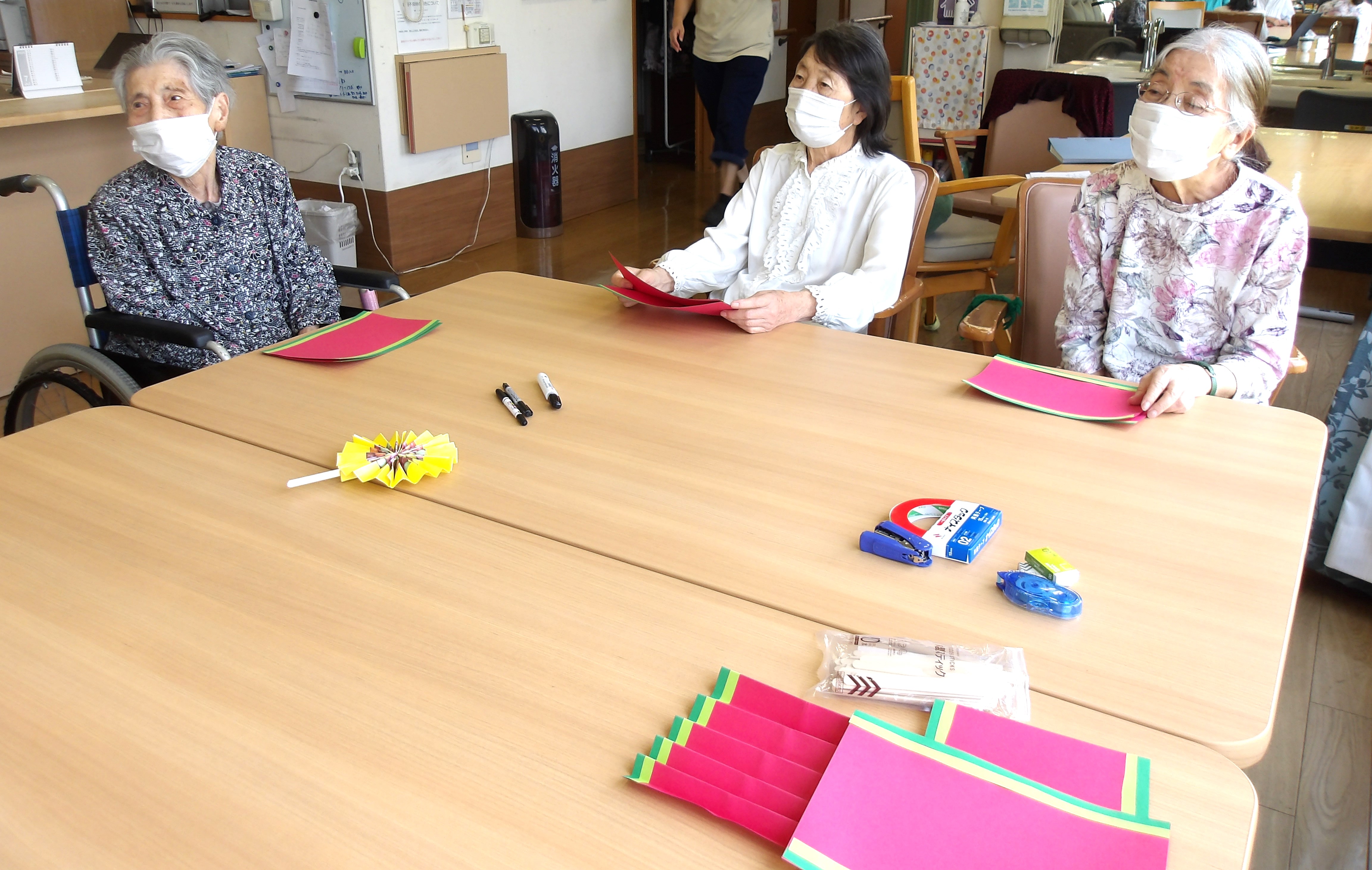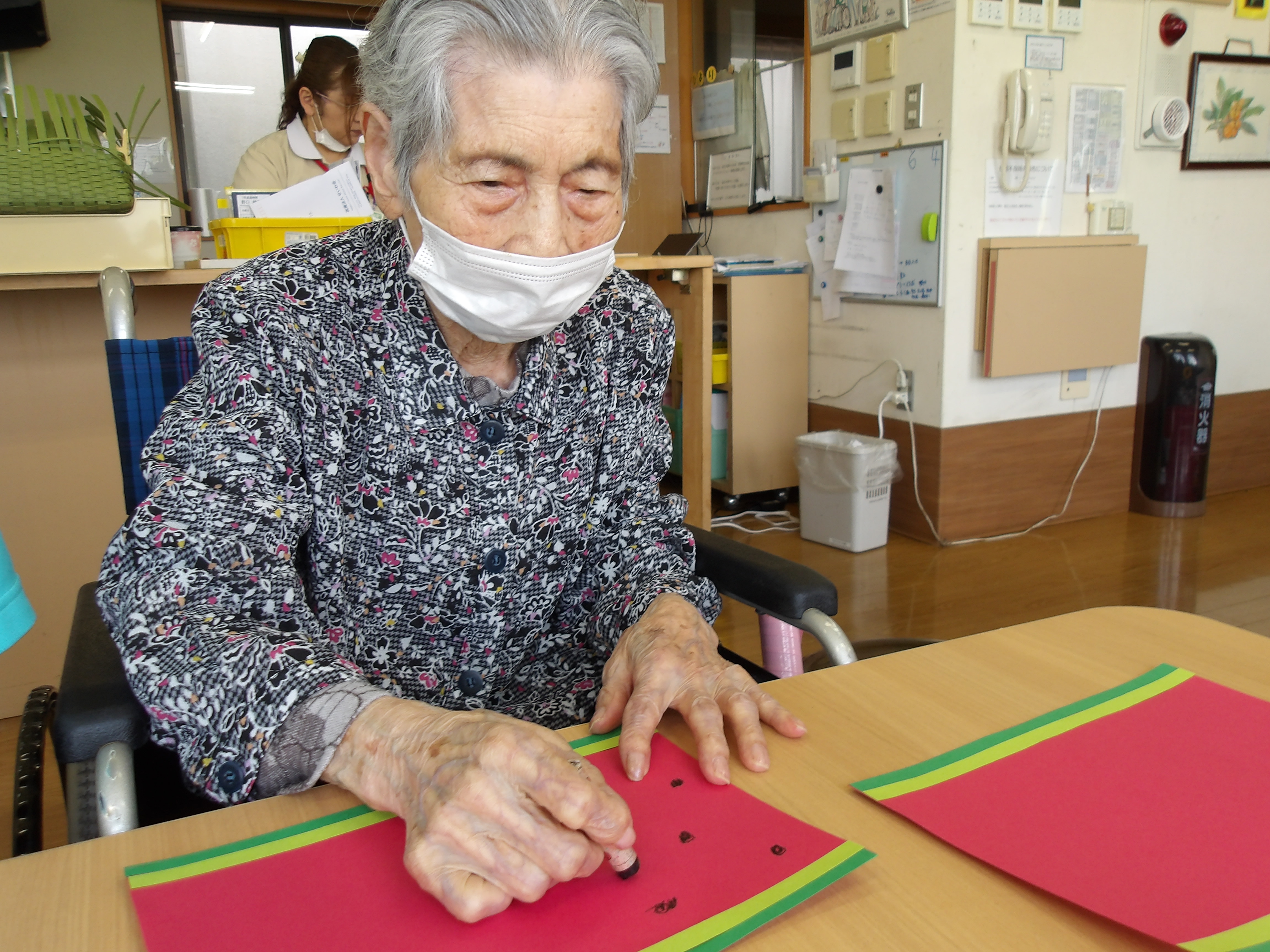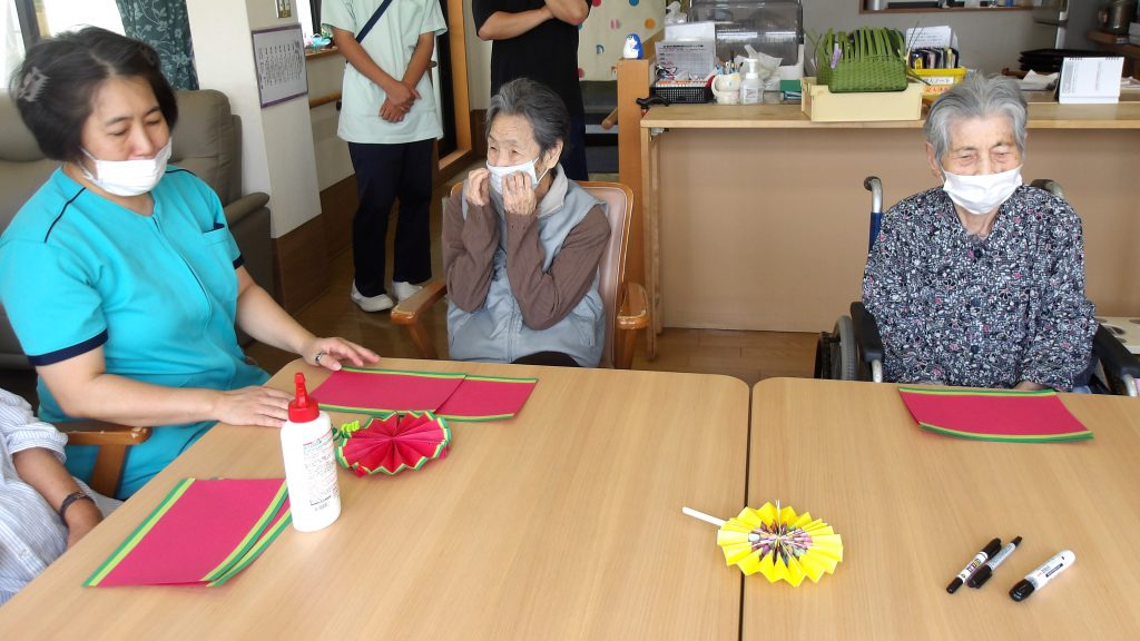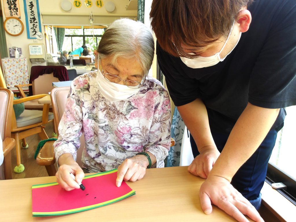 みなさんこんにちは!連日溶けそうなくらい暑い日が続いていますね💦35度に迫る猛暑の中、「暑いね~!」と言いながらも、今日は施設入所者の方をお招きしてみんなでスイカの形のうちわを作りました🍉